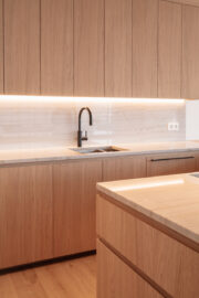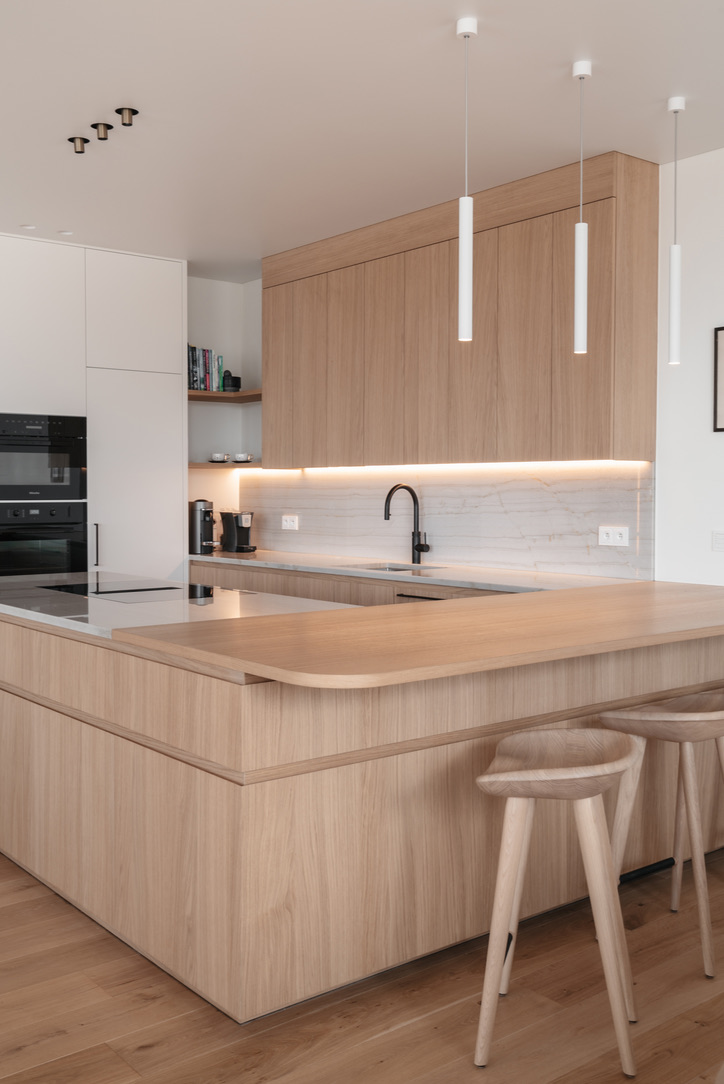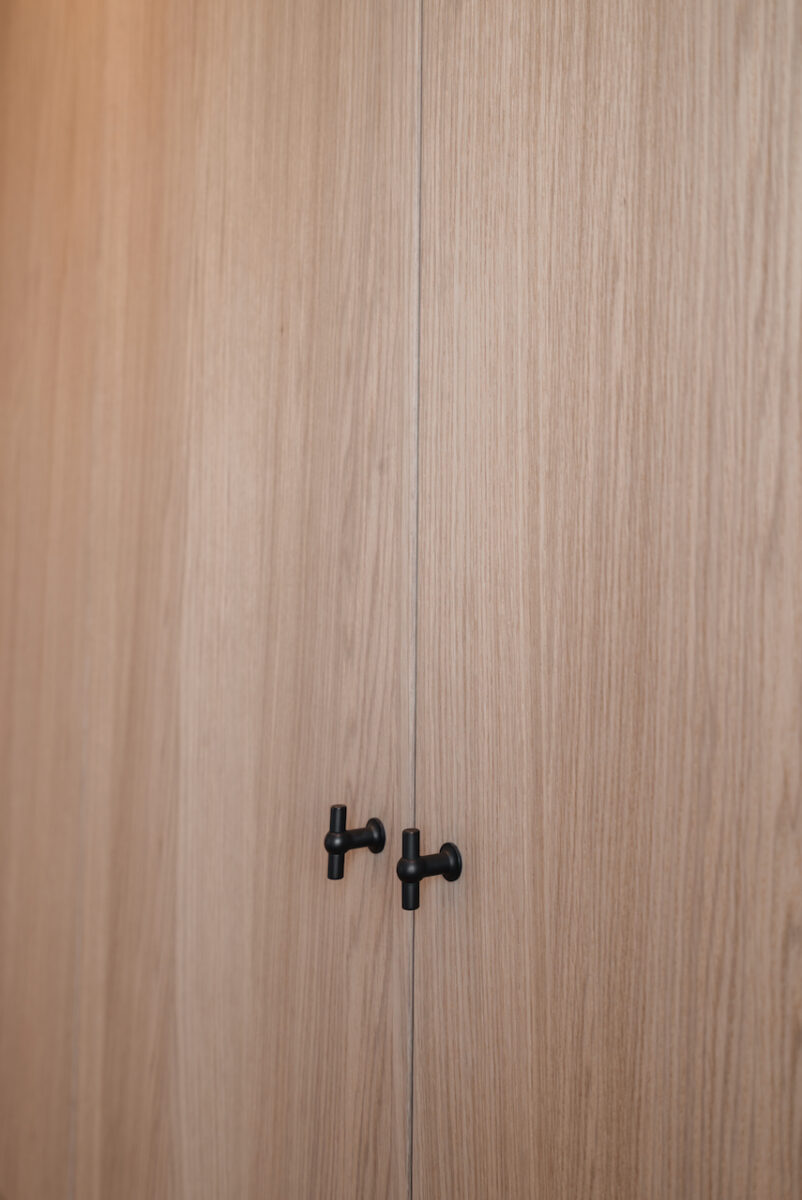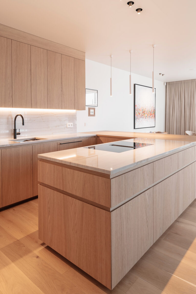 De compacte keuken werd volledig herwerkt en voorzien van maatmeubilair, afgestemd op de noden van de klant. Alles kreeg een logische plek, met oog voor functionaliteit en esthetiek.