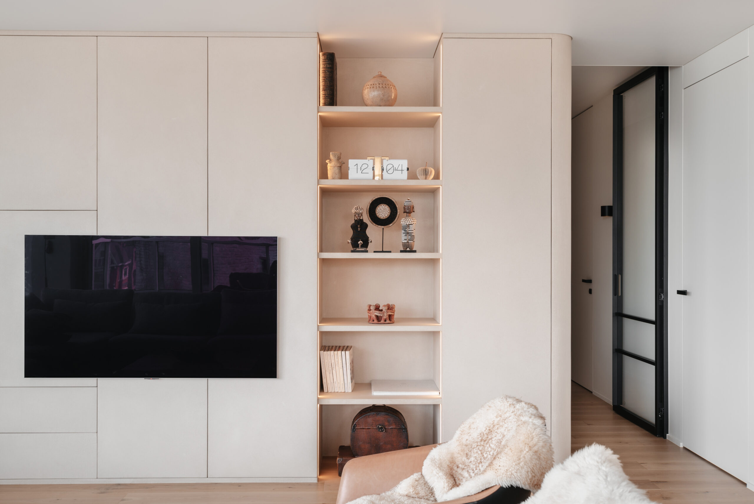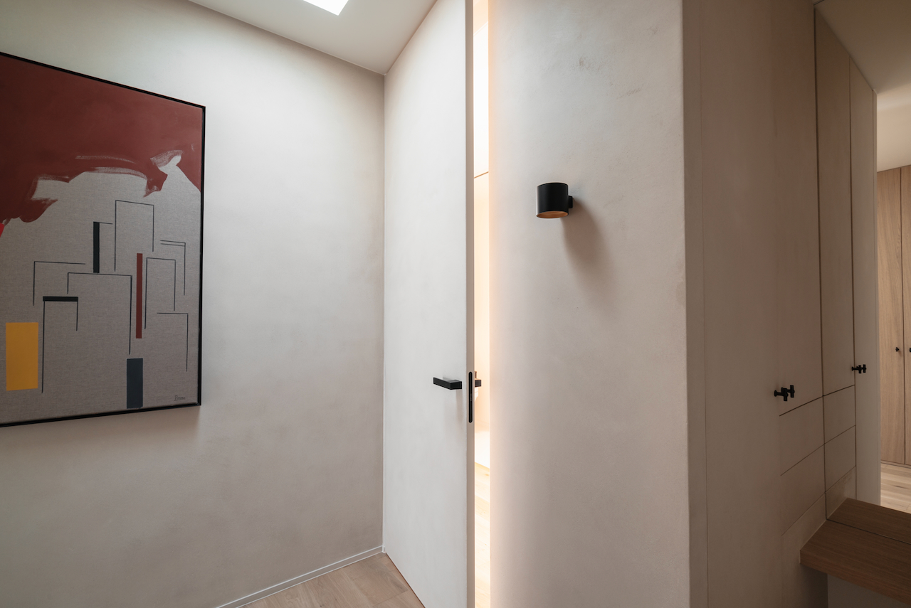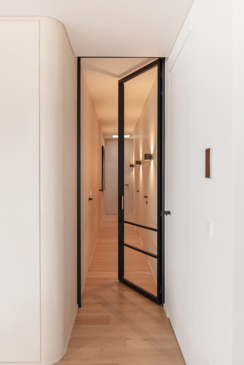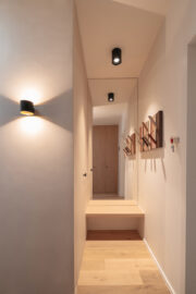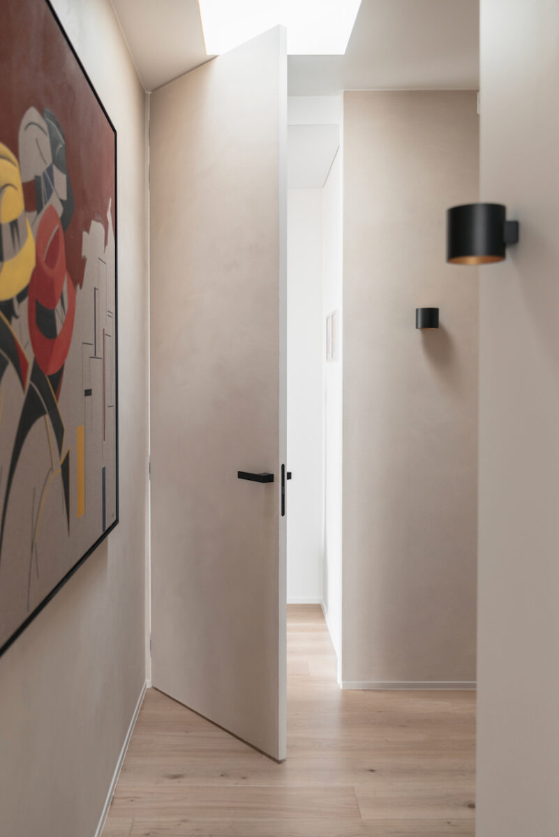 Bij aankoop was het dakappartement in het historische hart van Kortrijk quasi instapklaar, maar het voldeed niet aan de wensen van de klant, die de overstap maakte van een ruime landelijke villa naar een stadsappartement. De bestaande indeling werd daarom grondig herbekeken en hertekend.