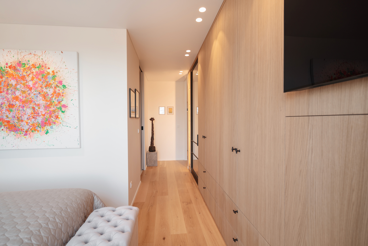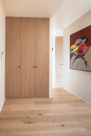 De oorspronkelijke drie slaapkamers met ensuite badkamers maakten plaats voor een nieuwe, doordachte invulling: een hobby- en logeerkamer met eigen badkamer, een rustige studieruimte en een ruime master suite met ensuite badkamer en royale dressing. Door de badkamer in de voormalige studieruimte op te geven, ontstond er extra ruimte voor de dressing in de master bedroom.